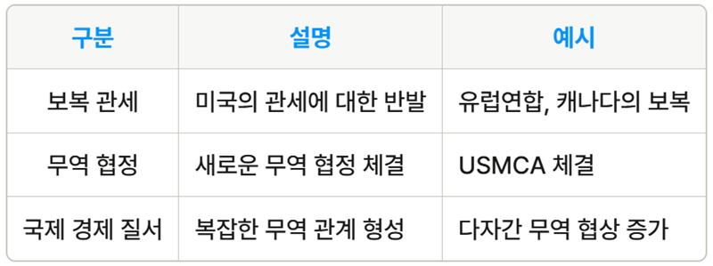 트럼프의 관세 인상은 단순히 미국의 문제를 넘어 글로벌 경제 질서에 큰 영향을 미쳤습니다. 여러 국가들이 미국의 관세 정책에 대응하기 위해 보복 관세를 부과하거나 새로운 무역 협정을 체결하는 등 변화가 일어났습니다. 이러한 변화는 국제 무역의 복잡성을 더욱 증가시켰습니다.