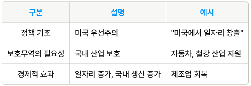 이러한 정책은 미국 제조업의 일자리 창출과 경제 성장을 도모하는 데 초점을 맞추었습니다.