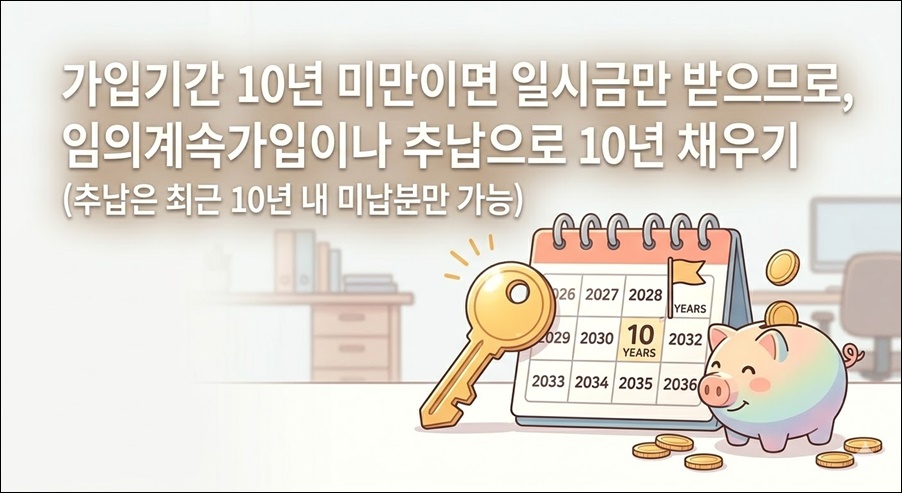 - 가입기간 10년 미만이면 일시금만 받으므로, 임의계속가입이나 추납으로 10년 채우기 (추납은 최근 10년 내 미납분만 가능)