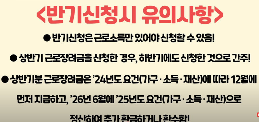 반면, 반기 신청은 2024년 하반기 소득분은 2025년 3월 1일부터 3월 17일까지 신청하여 6월에 받을 수 있고, 2025년 상반기 소득분은 9월 1일부터 9월 15일까지 신청하여 12월에 지급받을 수 있습니다.