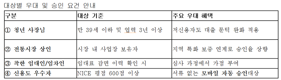 ① 청년 사장님: 만 39세 이하 및 업력 3년 이상 시 저신용자도 문턱 완화 ② 전통시장 상인: 시장 내 사업장 보유 시 지역 특화 보증 연계로 승인율 상향 ③ 착한 임대인/임차인: 임대료 감면 이력 확인 시 심사 가점 부여 ④ 신용도 우수자: NICE 평점 600점 이상 시 서류 없는 모바일 자동 승인 대상