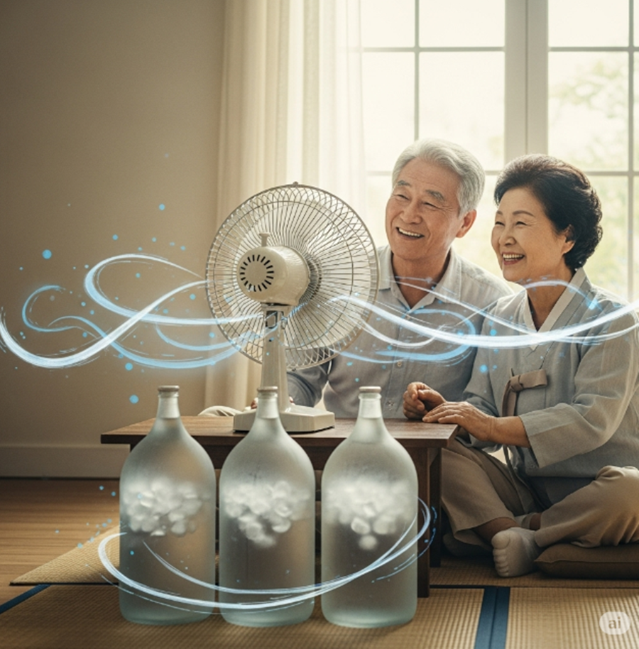 선풍기 앞에 얼음 그릇이나 얼린 페트병을 놓아보세요. 얼음이 녹으면서 발생하는 차가운 공기가 선풍기 바람을 타고 실내로 퍼져나갑니다.