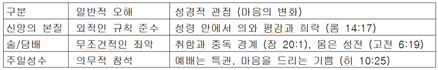 많은 그리스도인들이 술과 담배를 멀리하고 주일에 교회에 가는 것을 신앙생활의 전부로 여깁니다. 그러나 로마서 14장 17절은 "하나님의 나라는 먹는 것과 마시는 것이 아니요 오직 성령 안에서 의와 평강과 희락이라"고 말씀하며, 신앙의 본질이 외적인 것에 있지 않음을 분명히 합니다.
