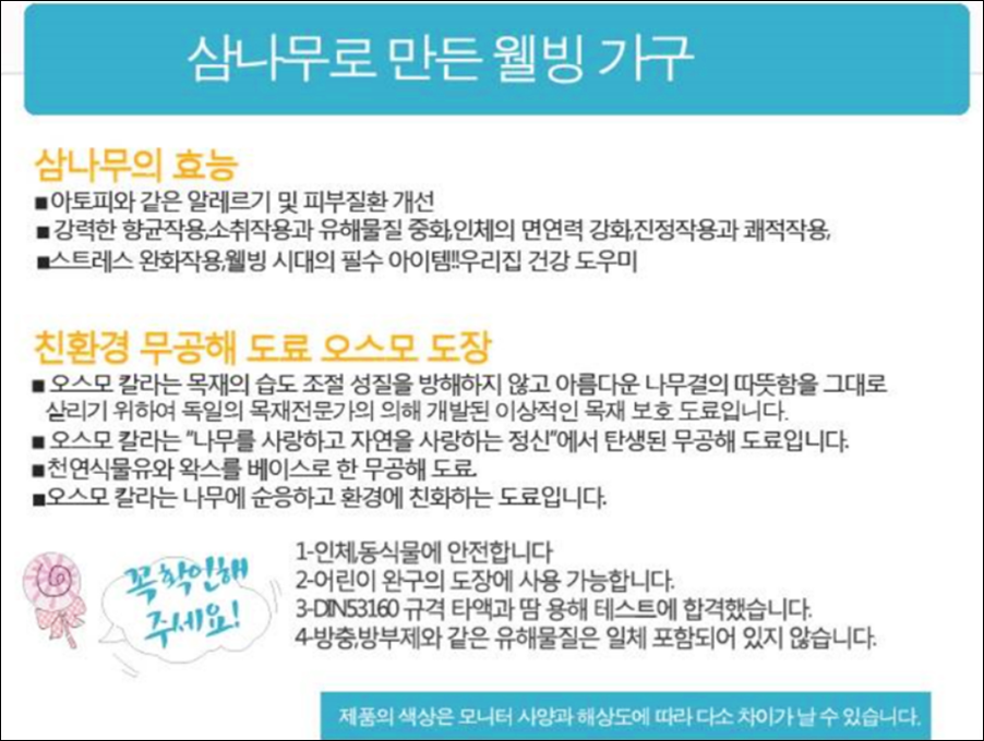 삼나무의 아름다운 나뭇결과 따뜻함을 그대로 살리면서 가구 수명을 길게 해주는 독일산 친환경 오스모 도료를 사용했습니다. "나무를 사랑하고 자연을 사랑하는 정신"으로 탄생한 무공해 도료이니 안심하고 사용하실 수 있습니다.
