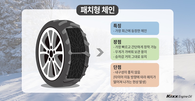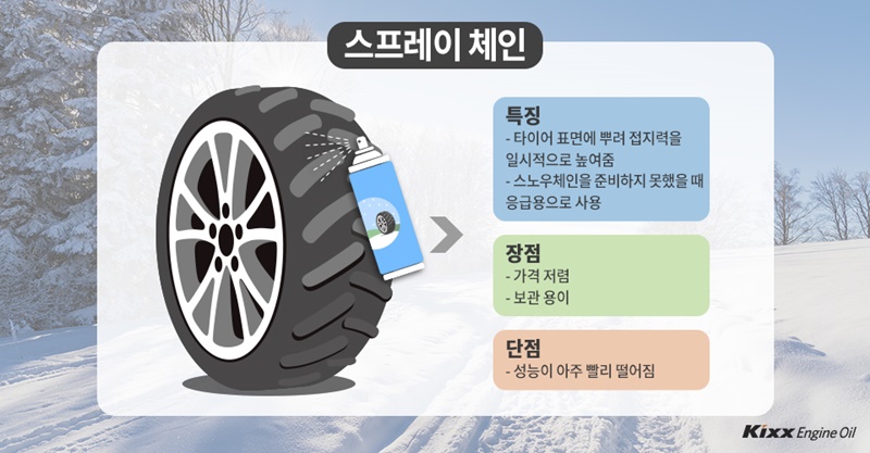 또한, 아스팔트가 드러난 도로에서 급제동을 하는 것은 매우 위험합니다. 스프레이 체인을 제외한 대부분의 스노우 체인은 아스팔트와의 마찰로 인해 쉽게 파손될 수 있습니다.