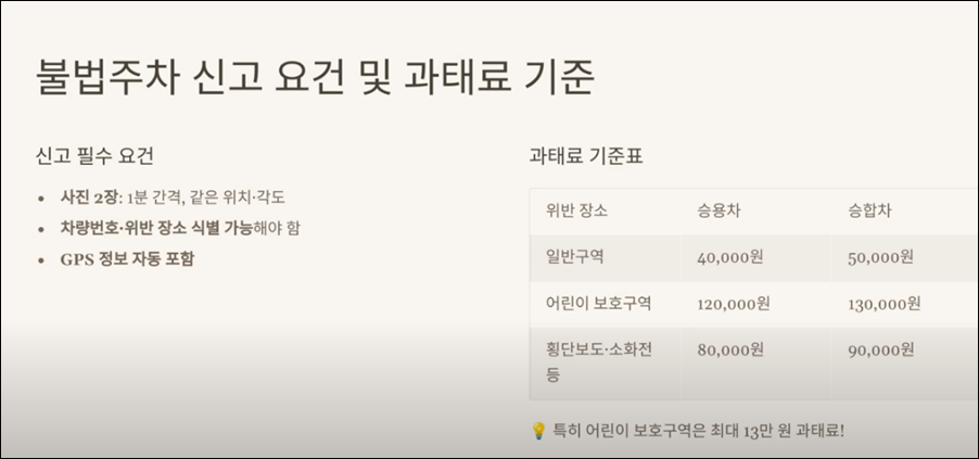 일반적인 위반의 경우 4~5만 원의 과태료가 부과되며, 특히 어린이 보호 구역 같은 경우 최대 13만 원까지 부과될 수 있습니다.