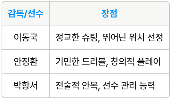 이 도표를 통해 각 선수와 감독이 지닌 강점을 한눈에 볼 수 있습니다. 이들의 만남은 한국 축구의 미래를 더욱 밝게 할 것입니다.