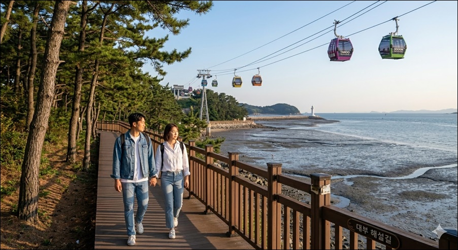 오전 10시 탄도항 도착 후 케이블카 탑승으로 시작하세요. 왕복 15분 소요되며 바다 위 33m 높이에서 서해 일몰을 감상할 수 있습니다. 점심은 탄도항 횟집거리에서 자연산 회와 칼국수를 즐기고, 오후에는 대부해솔길 산책과 구봉도 낙조전망대에서 석양을 담으면 완벽한 하루가 완성됩니다.