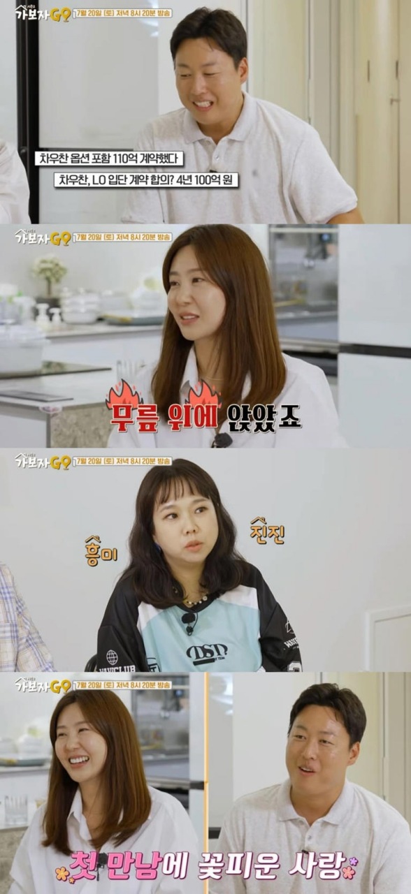이어 아내는 "지인에게 그 얘기를 하고 차우찬의 무릎 위에 앉았다"며 '무릎 플러팅'을 시도했다고 전했다. 홍현희가 "그때 기분이 어땠나? 심쿵 했나?"라고 묻자, 차우찬은 "안아줬다"며 당시의 상황을 돌이켜보았다.