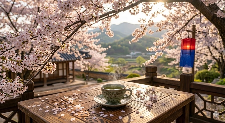 세련된 카페의 테라스에서 벚꽃을 배경으로 여유롭게 '차 한 잔의 여유' 콘셉트 사진을 남기기 좋습니다.