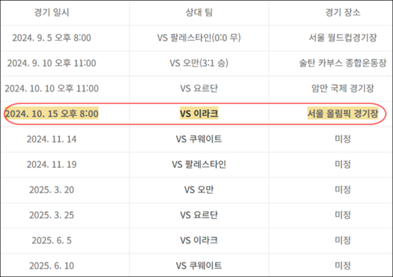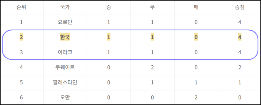 현재 우리나라 요르단, 이라크 등과 함께 승점 4점 기록하고 있으며, 2024. 10.10(목) 펼쳐지는 요르단 경기에 따라 순위가 뒤바뀌고, 있는 중이며 오늘 이라크 경기는 매우 중요한 경기가 될 곳으로 예상됩니다.