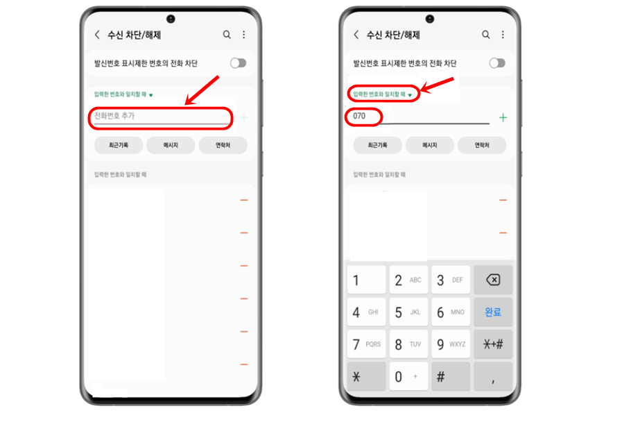 '입력한 번호와 일치할 때'가 아닌 '입력한 번호로 시작할 때' 옵션을 반드시 선택합니다. 이 설정은 070으로 시작하는 모든 번호에 차단 기능을 적용하게 해 줍니다.