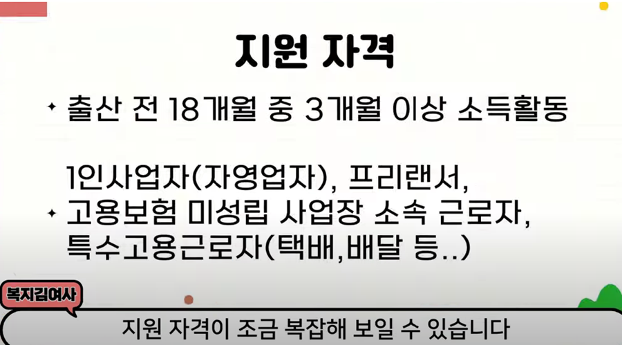 2. 출산 전 18개월 중 3개월 이상 소득 활동 이력이 있어야 합니다. (사업소득 또는 기타소득 증빙)