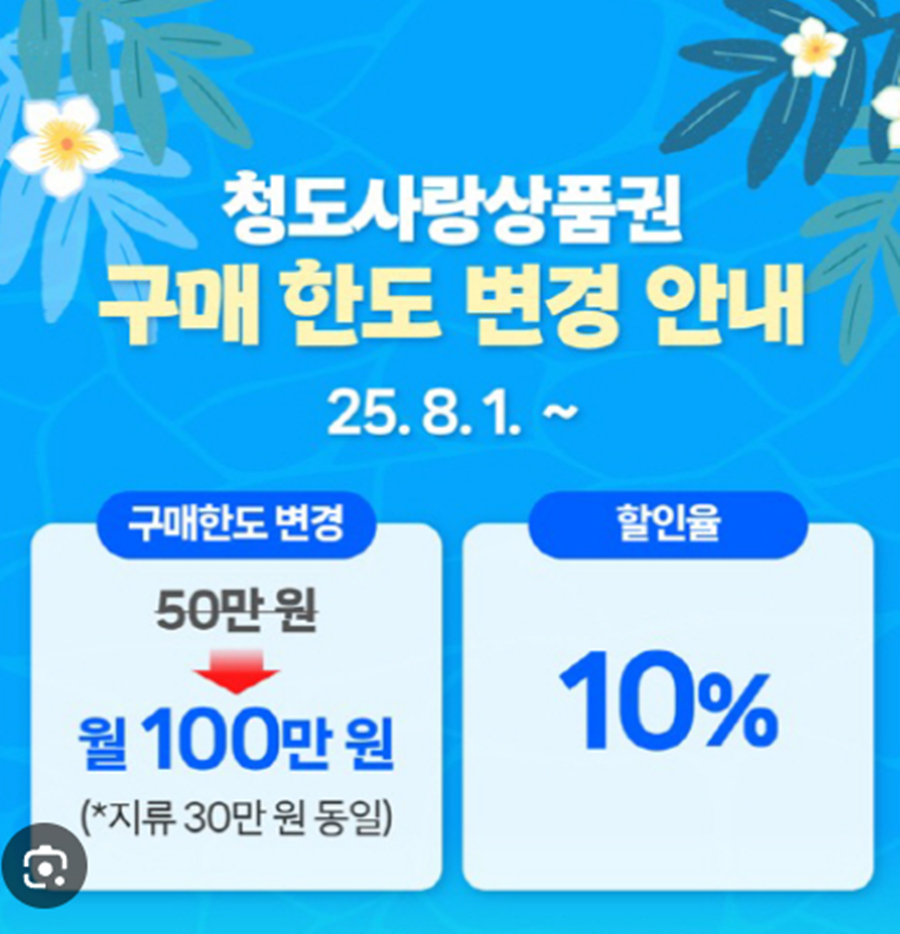 가장 큰 변화는 바로 구매 한도 상향입니다. 기존 월 50만 원이던 구매 한도가 100만 원으로 늘어나 더 많은 금액을 할인 혜택과 함께 구매할 수 있게 됩니다.