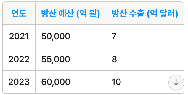 한국의 방산 산업은 최근 몇 년간 급속히 성장해왔습니다. 정부의 정책 지원과 해외 수출 증가로 인해 방산 관련 기업들은 새로운 기회를 맞이하고 있습니다. 다음 도표는 한국 방산 산업의 성장 추세를 보여줍니다.