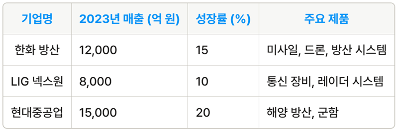 한국 방산 기업 중에서도 특히 주목할 만한 기업들이 있습니다. 이들 기업은 기술력과 시장 점유율에서 두각을 나타내고 있으며, 앞으로의 성장 가능성이 큽니다. 아래의 도표는 주요 방산 기업들의 매출 및 성장률을 보여줍니다.