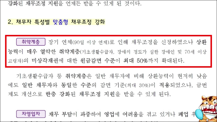 - 폭넓은 대상: 7년 이상 연체된 5천만 원 이하 무담보 채무를 가진 개인 및 소상공인이 주 대상입니다. 특히 기초생활수급자, 중위소득 60% 이하 저소득층 등 취약계층은 더욱 우대받습니다.